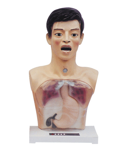 ■ 模型为标准的成人上半身。胸腔为解剖结构标志。透明的胸壳可直观演示操作功能。